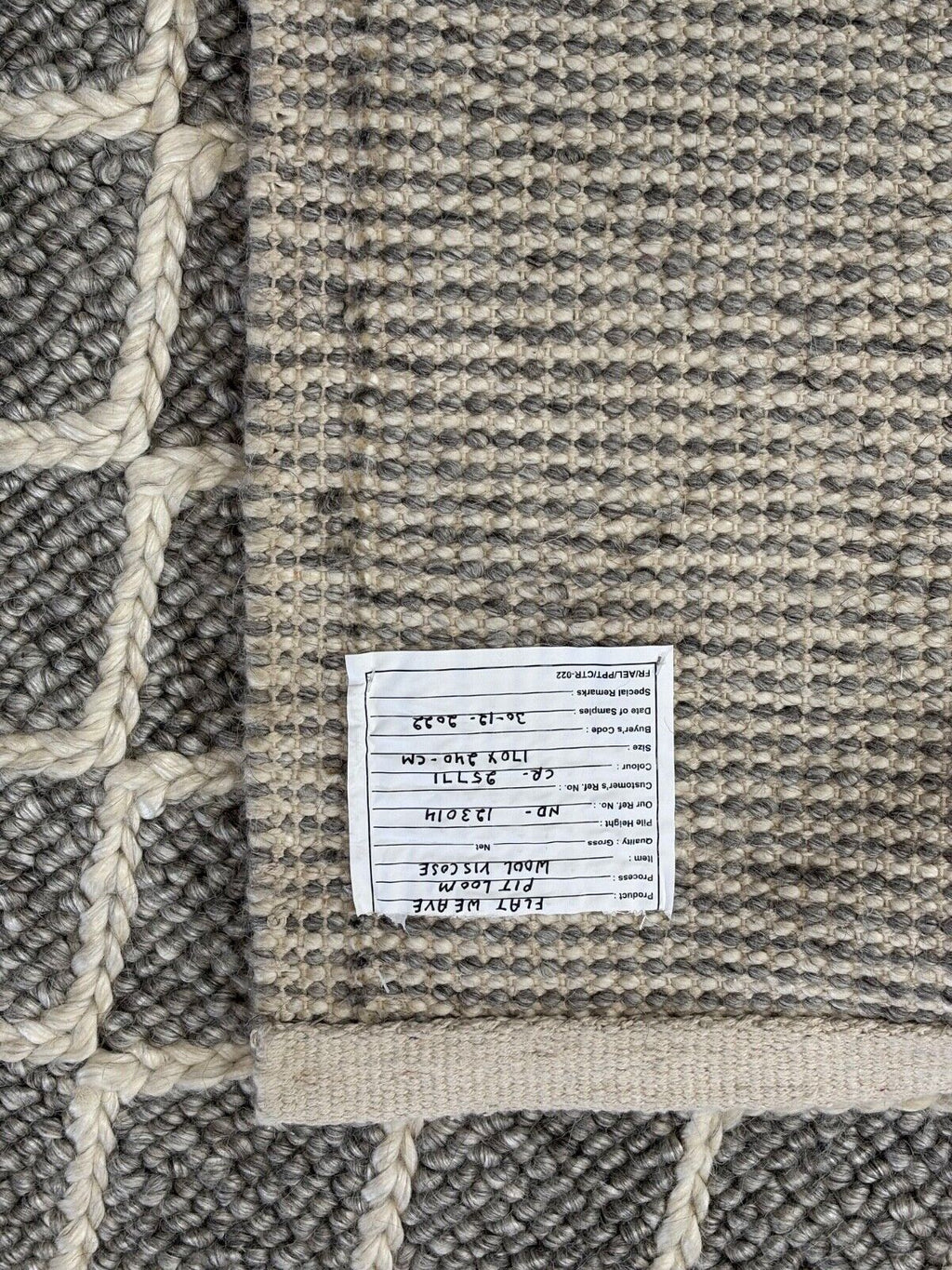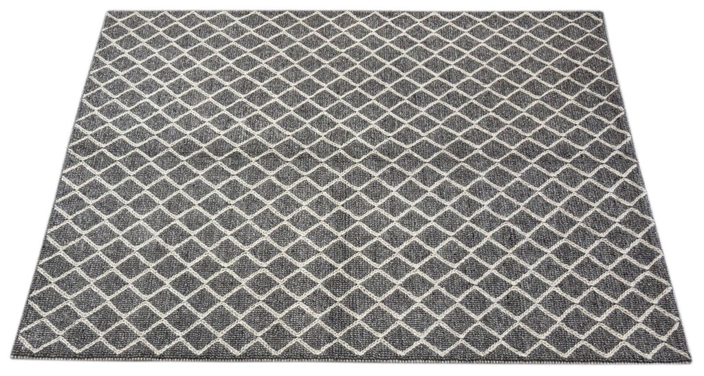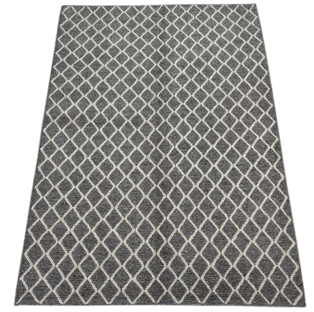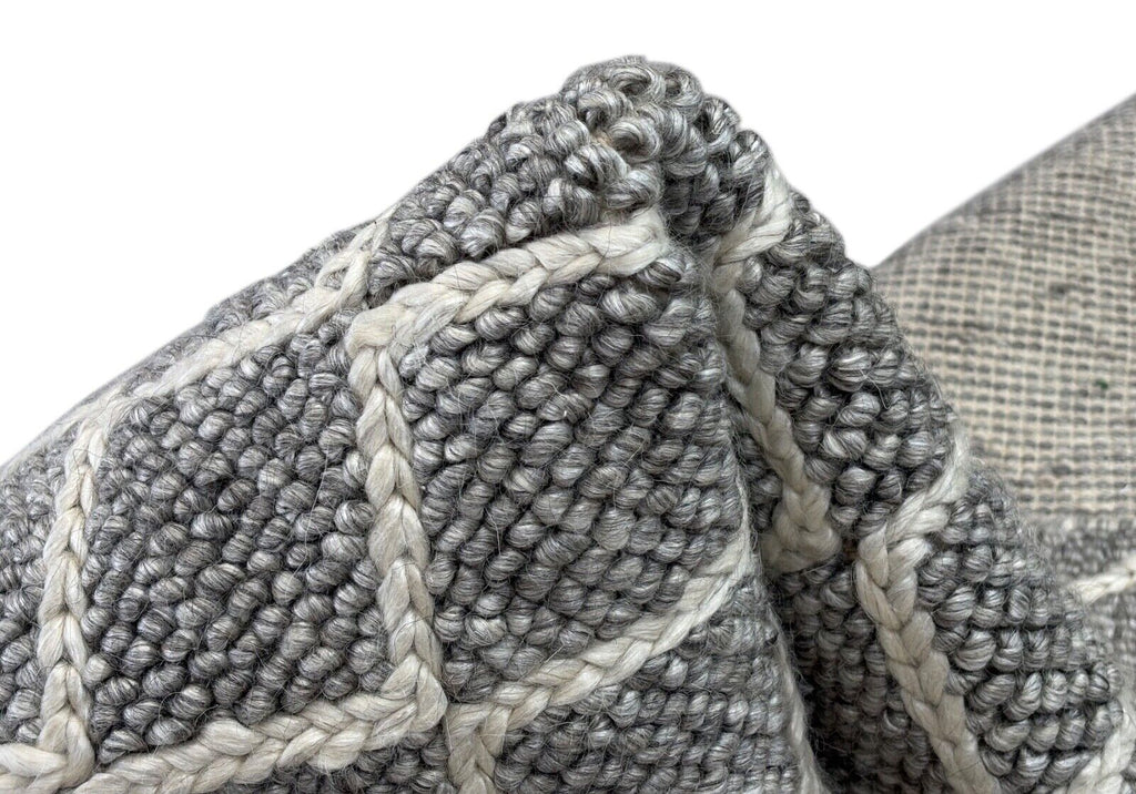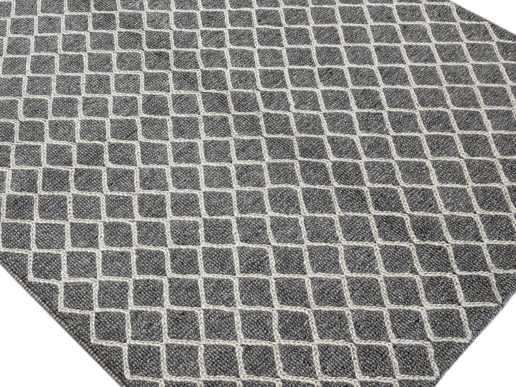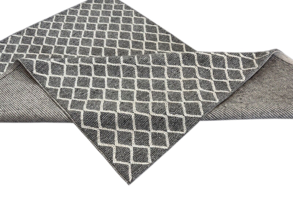 Tauchen Sie ein in zeitlose Eleganz mit diesem handgewebten Wollteppich, der jedem Raum einen Hauch von Raffinesse verleiht. Das geometrische Rautenmuster in zarten Grau- und Cremetönen ist in eine flache Webstruktur eingewoben und schafft so einen modernen und ansprechenden visuellen Effekt.