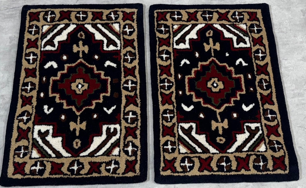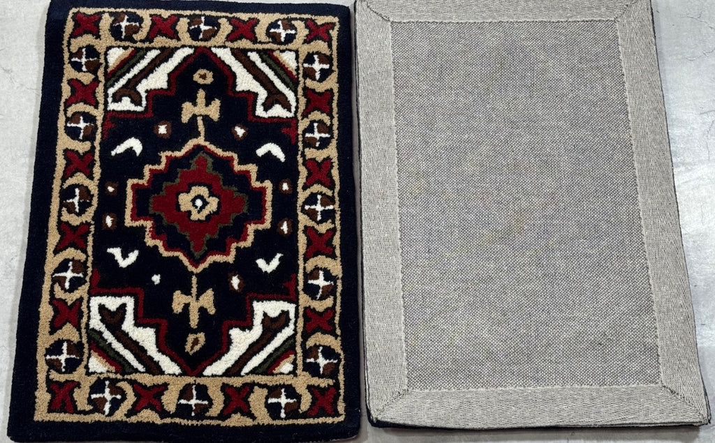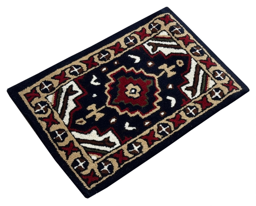 Dieser kleine Wollteppich ist perfekt als TĂĽrvorleger, FuĂźmatte, Dekoteppich oder fĂĽr das Auto. Er wird in Indien handgetuftet und zeigt ein klassisches Oriental-/Gabbeh-Muster.