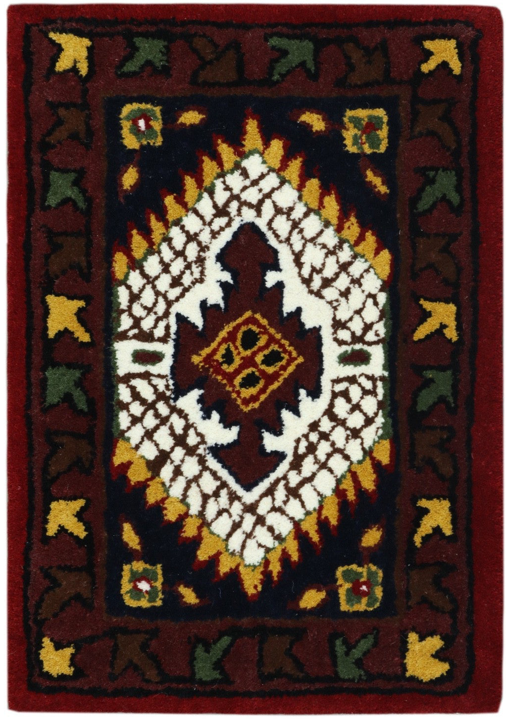 Dieser kleine Wollteppich ist perfekt als TĂĽrvorleger, FuĂźmatte, Dekoteppich oder fĂĽr das Auto. Er wird in Indien handgetuftet und zeigt ein klassisches Oriental-/Gabbeh-Muster.
