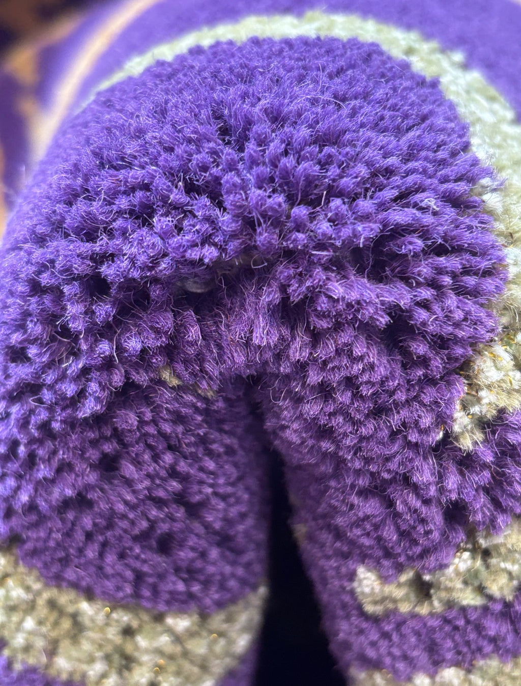 - Väri: Violetti, jossa vihreä ja keltainen kuvio