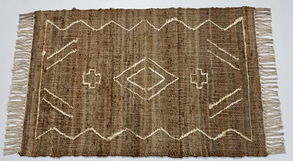 Ez a kézzel szőtt szőnyeg 100% jutából készült, a természetes barna és bézs árnyalatokat szőtt etnikai mintával ötvözi. Ideális kis szőnyegként a folyosóra, a konyhába, növények alá, vagy akár alátétként is a fontos dolgokhoz – sokoldalúan használható!