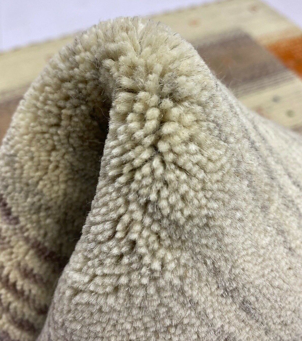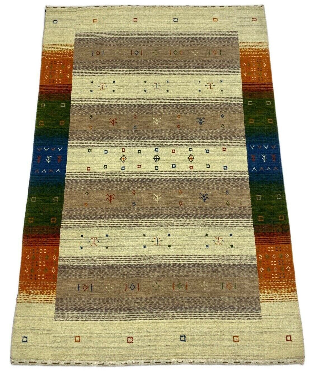 Gabbeh kilimas, 100 % vilnos, smėlio, oranžinės, mėlynos spalvos, lori audimo staklėmis, rankomis austas, 125 x 180 cm, S111