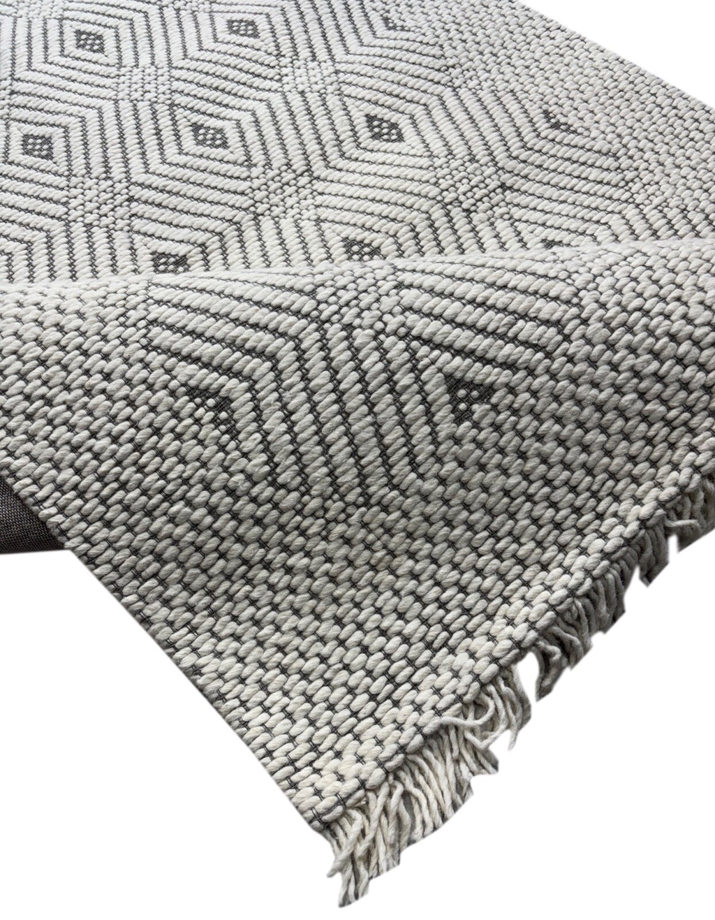 - Design: Traditioneller Kilim Dhurry-Stil, handgewebt mit einem geometrischen Muster in den Farben Schwarz und Elfenbein – zeitlos und stilvoll.