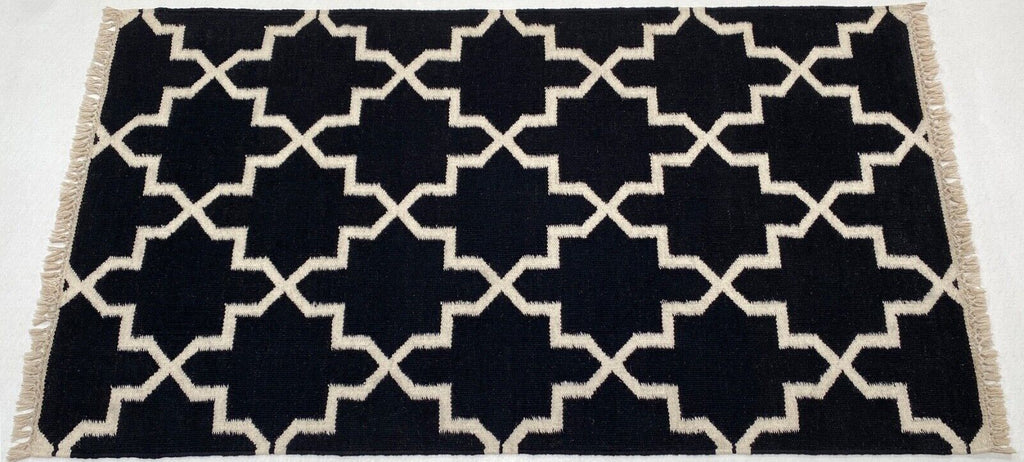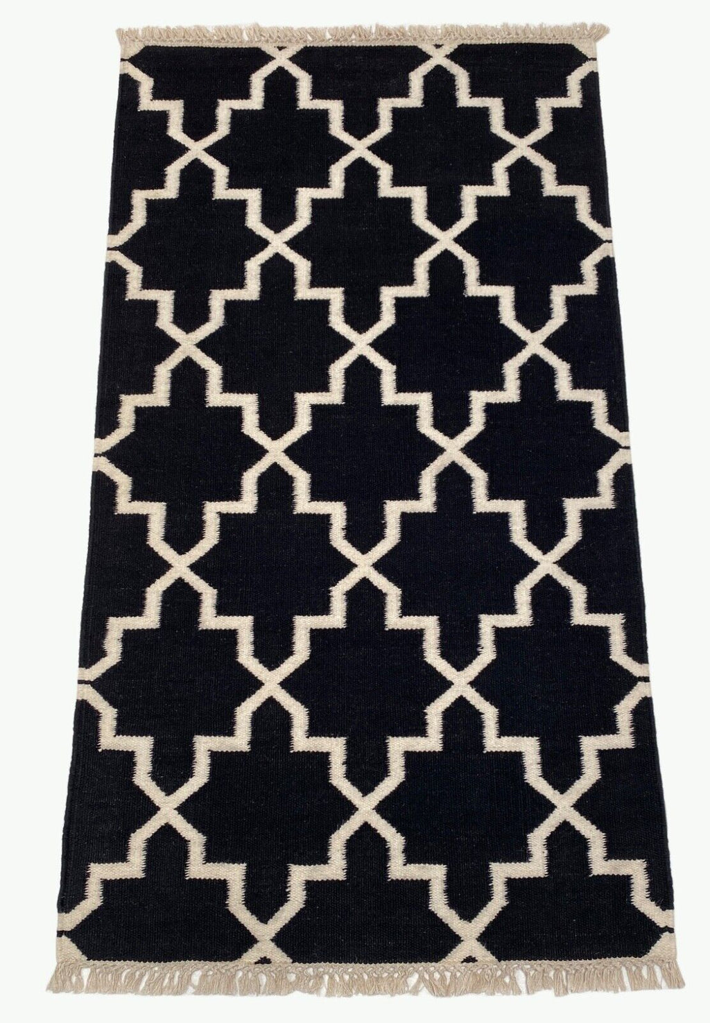 - Design: Traditioneller Kilim Dhurry-Stil, handgewebt mit einem geometrischen Muster in den Farben Schwarz und Elfenbein – zeitlos und stilvoll.