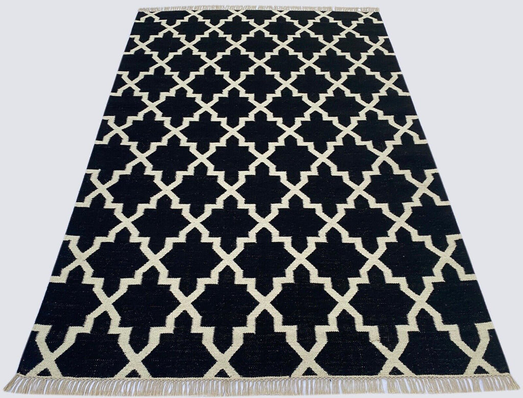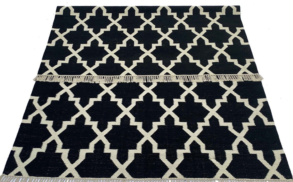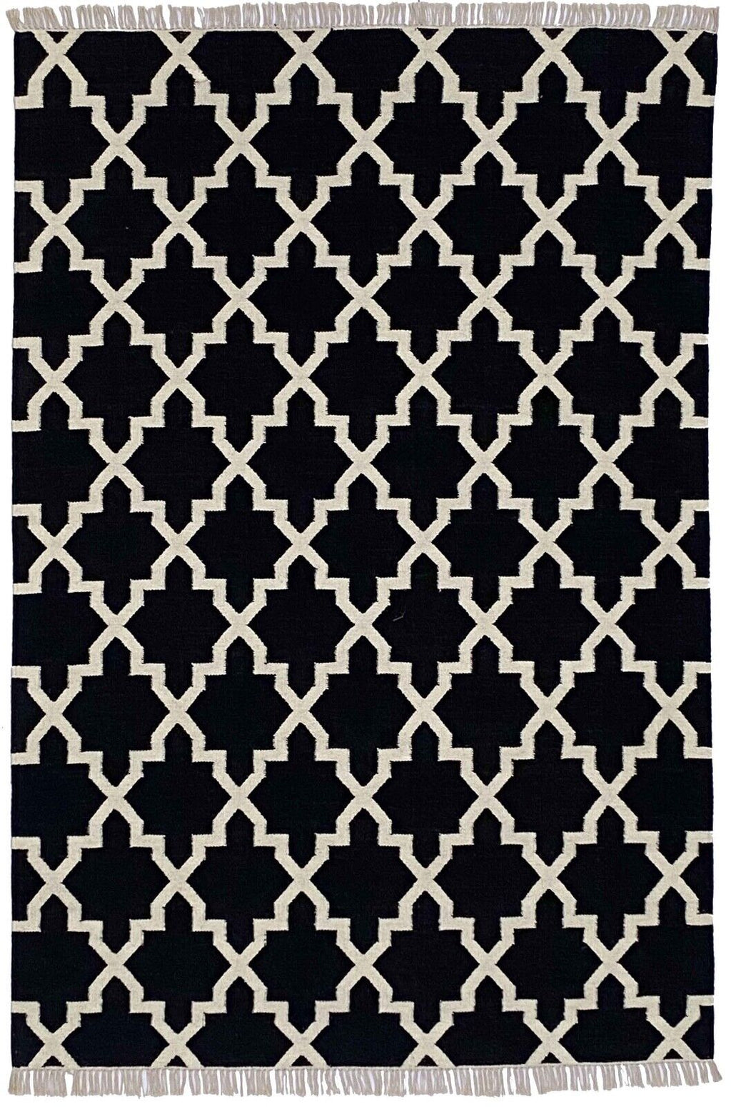 Handgefertigter Kilim Dhurry Teppich Schwarz und Elfenbein, 100% Wolle, Made in India
