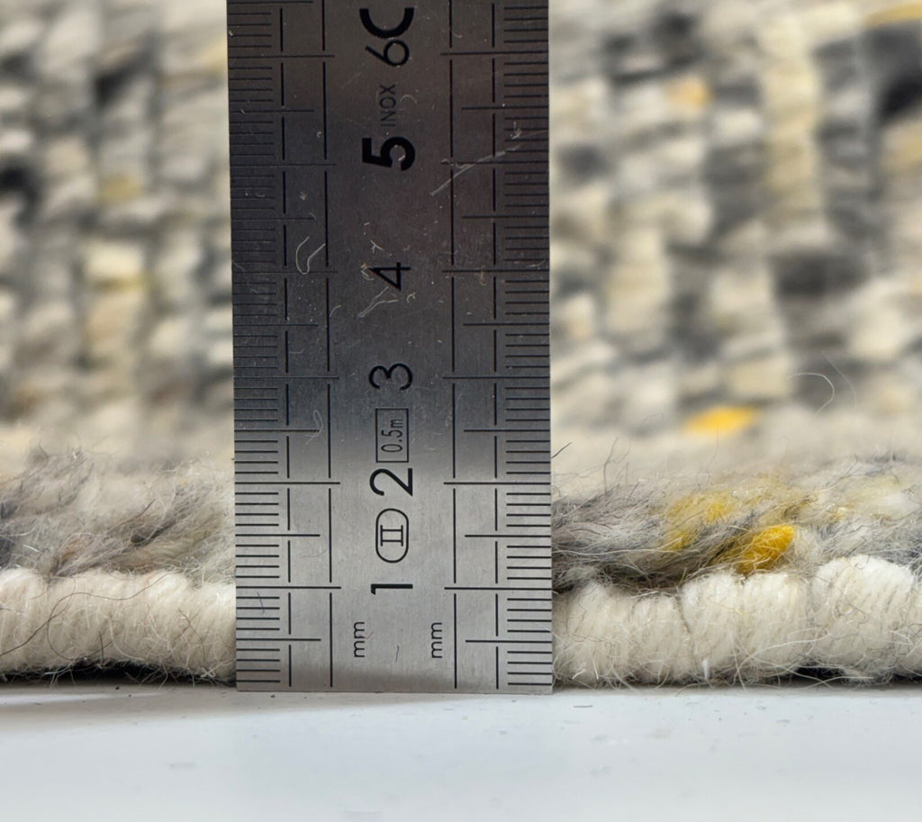 Dieser handgeknüpfte Teppich aus Indien verbindet traditionelle Handwerkskunst mit modernem Design. Mit seiner flachgewebten Optik und einer Gesamtdicke von 14 mm bietet er eine stilvolle und zugleich praktische Lösung für verschiedene Wohnbereiche.