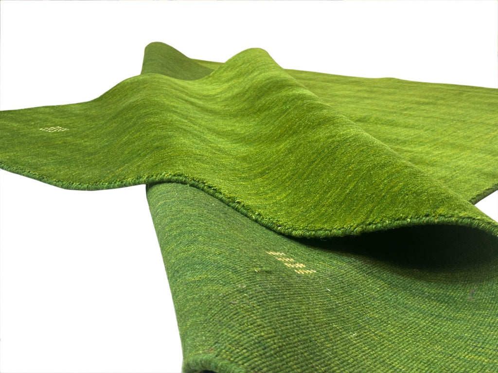 Bringen Sie mit diesem handgewebten Gabbeh Teppich in sanftem Grün ein Stück handwerklicher Kunst und luxuriösen Komfort in Ihr Zuhause.