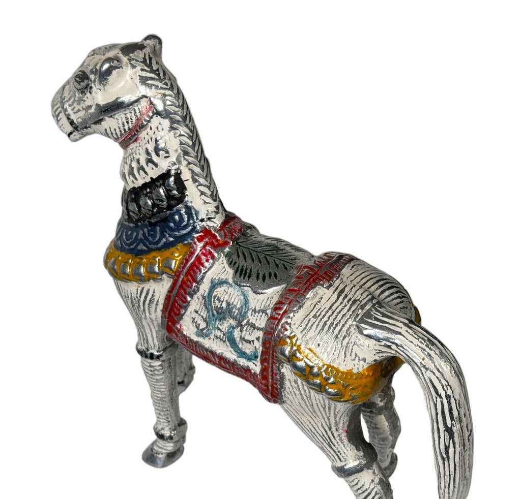 Tauchen Sie ein in die zeitlose Eleganz indischer Handwerkskunst mit unserer faszinierenden handgefertigten Pferdeskulptur, die mit der traditionellen Minakari-Technik verziert ist. Minakari, auch als Miniatur für die Metalldekoration bekannt, ist eine feine Kunst, die diesem außergewöhnlichen Kunstwerk eine zauberhafte künstlerische Note verleiht.