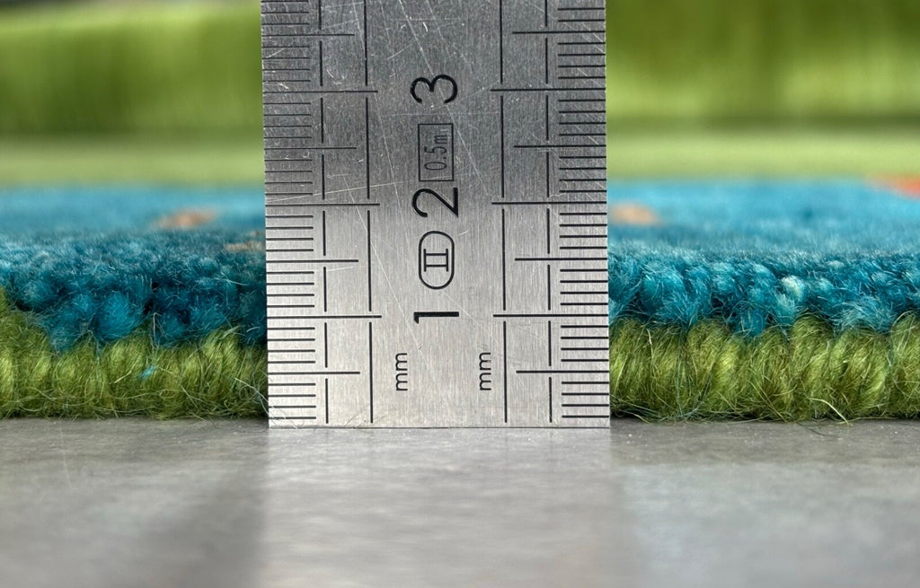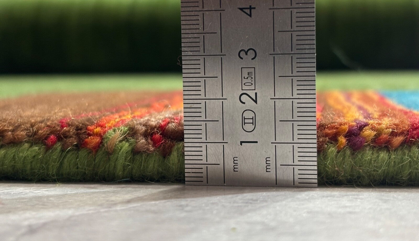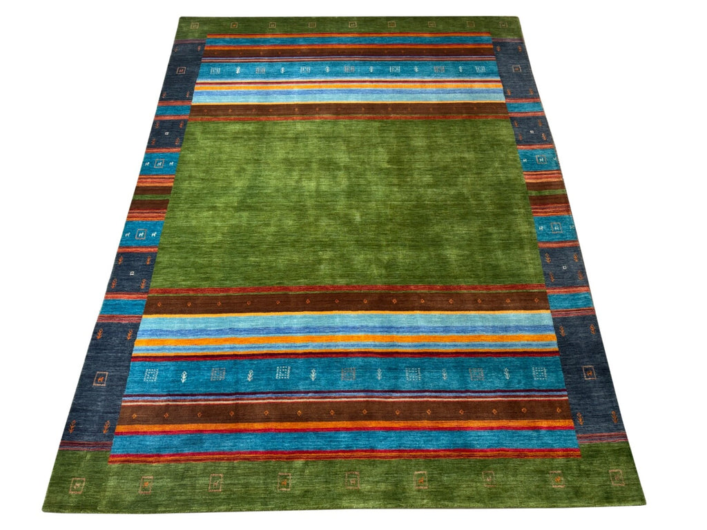 Ein echtes Einzelstück! Dieser großformatige Handloom-Teppich (250 x 350 cm) begeistert mit seiner leuchtend grünen Basis und farbenfrohen Bordüre. Durch die handgewebte Fertigung und die Verwendung reiner Schurwolle ist jeder Teppich ein Unikat – ideal für große Wohnräume mit Charakter.