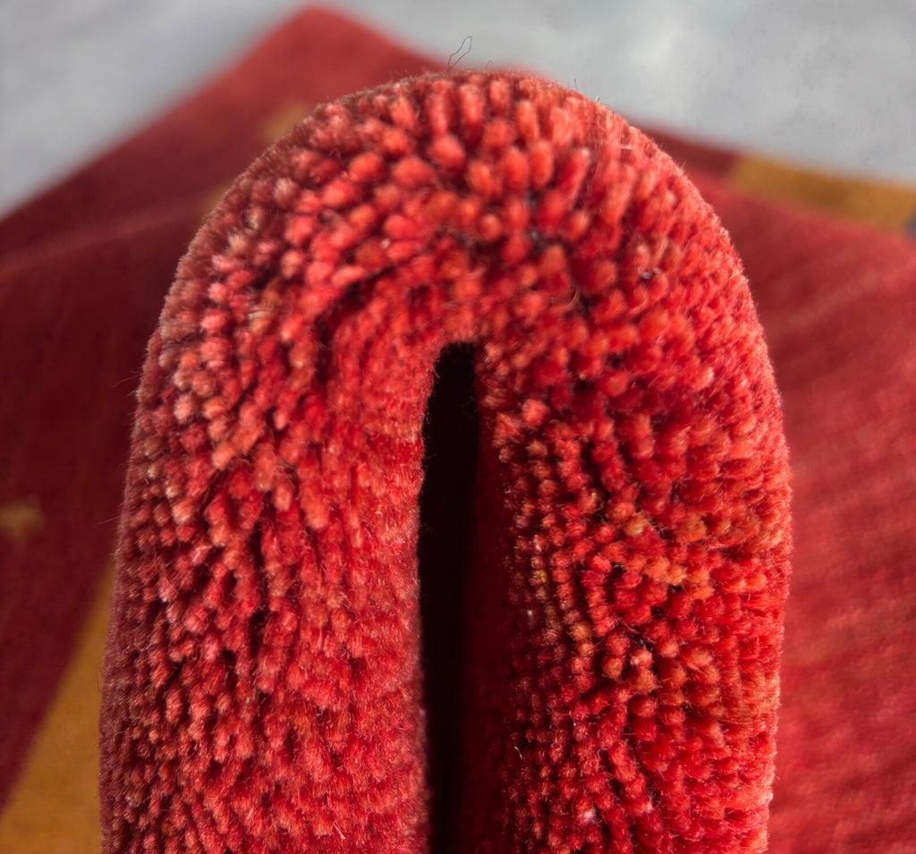 Verleihen Sie Ihrem Raum einen Hauch von Wärme und Charakter mit diesem einzigartigen, handgewebten Wollteppich. Mit seinem kräftigen Rotton und den farbenfrohen Akzenten in Blau und Gelb bringt dieser Teppich stilvolle Lebendigkeit in jedes Zuhause.