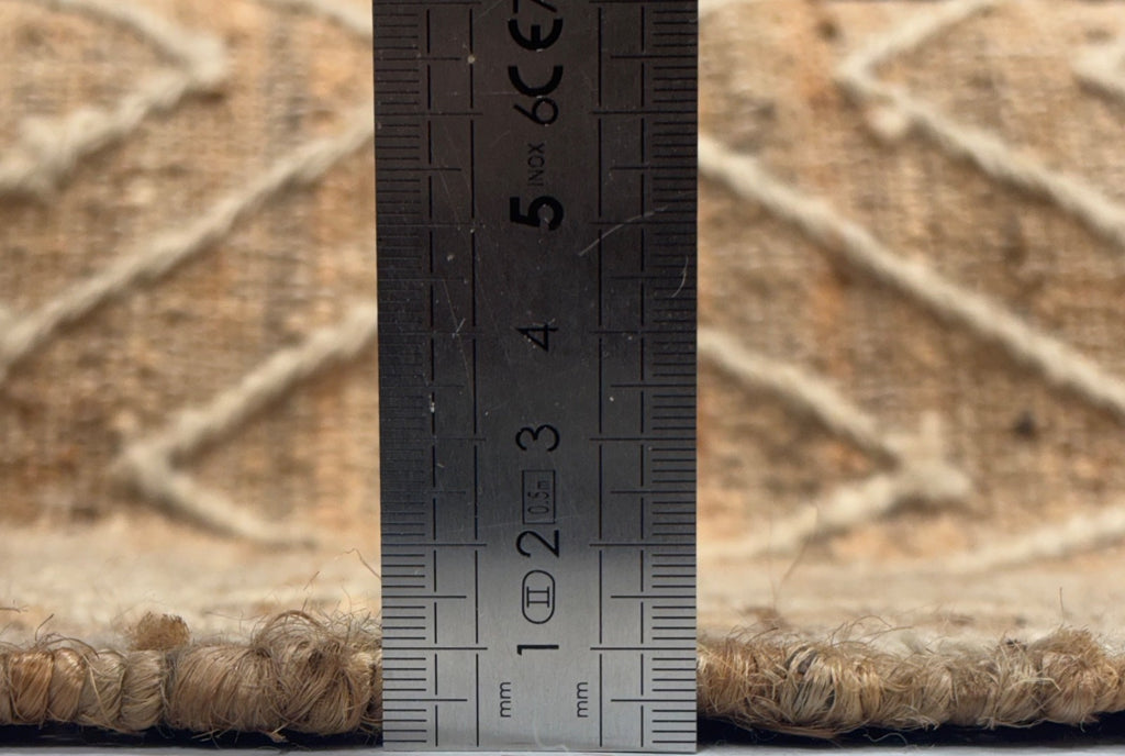 Ta ročno tkana preproga, izdelana iz 100 % jute, združuje naravne rjave in bež tone s tkanim etničnim vzorcem. Idealna kot majhna preproga na hodniku, v kuhinji, pod rastlinami ali celo kot podloga za vroče predmete – vsestranska!